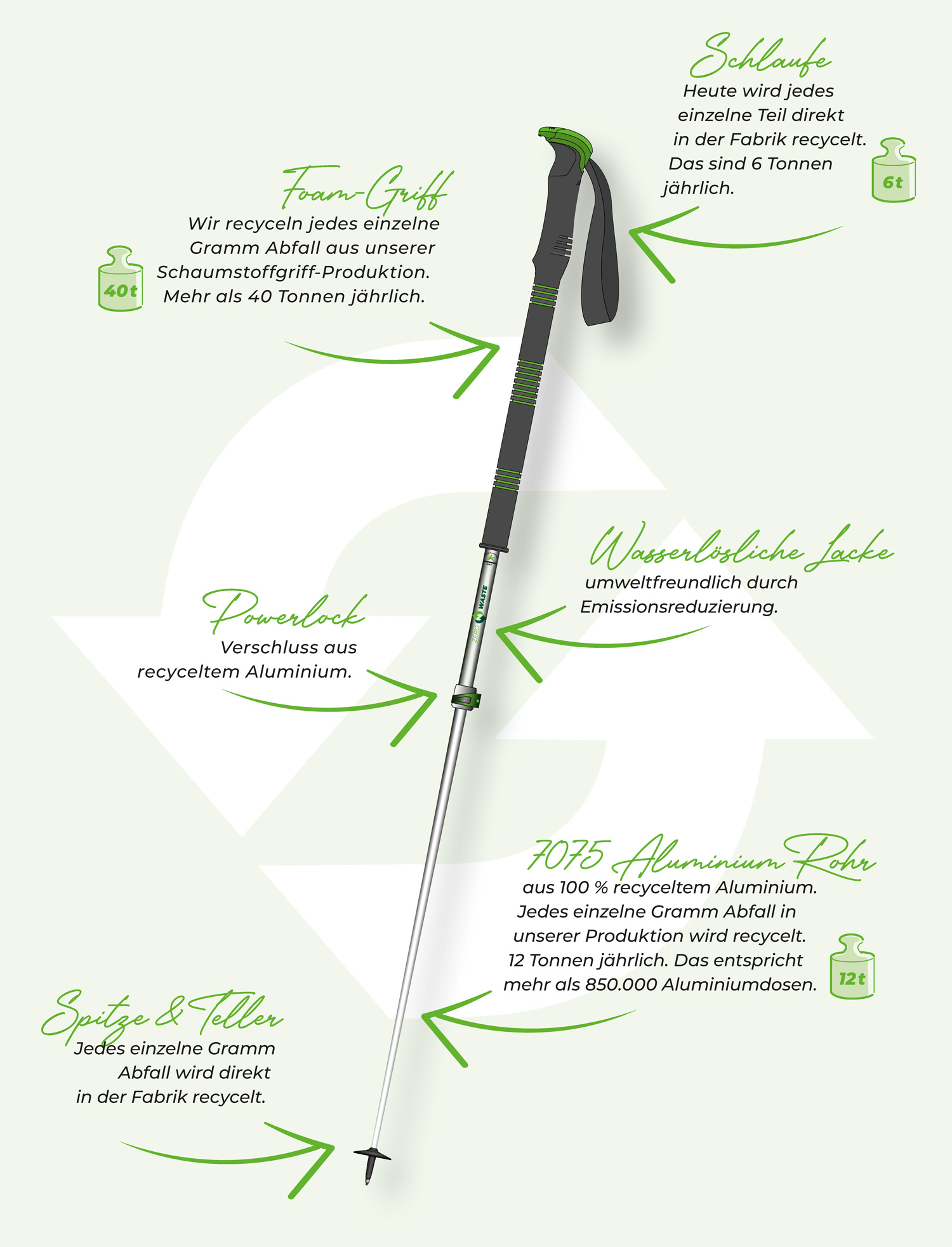Sollte Ihr Stock nicht mehr reparierbar sein, senden Sie ihn bitte an uns zurück. Wir haben eine eigene Recyclingabteilung eingerichtet. Nur so lassen sich alle Komponenten des Stockes sauber trennen und recyceln.